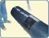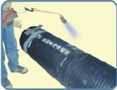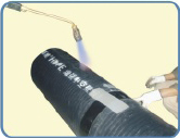 ④在收縮帶接口處貼上熱熔膠片,先加入熱熔膠片接口的位置,加熱至熔膠熔化后,把其壓緊在管材上,并用濕布冷卻使其粘固在管材上。(此步驟也可用鋼夾拼接固定熱收縮帶)