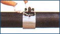 ③緊固熱熔帶:用熱熔帶將管道連接部位緊緊包住,連接端包在內(nèi)圈,從兩側(cè)插入pe棒填充熱熔帶端部空閑;鋼扣帶包住熱熔帶用夾鉗上緊,使熱熔帶與管壁緊緊靠在一起。鋼扣帶邊緣要與熱熔帶的邊緣對齊。