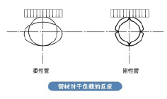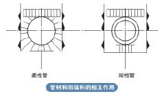 在工程應(yīng)用中,管低墊層及回填土的密實度,決定了“管與土”系統(tǒng)的負(fù)載能力及管道的徑向變形率,因此要求回填土達(dá)到規(guī)定的密實度(一般為95%),以保證管道的安全運行。下圖為管材對于負(fù)載的反應(yīng)和管材與回填料間的相互作用。