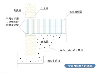 6.3管道位于軟土地基或低洼、沼澤、地下水位低的地段時,與檢查井宜采用短管連接。即直接與檢查井連接的連接管長度宜采用0.5~0.8m,然后在與整根管連接 。與磚砌或混凝土檢查井連接的短管上應(yīng)設(shè)止水圈,短管與檢查井相接合的表面砂漿應(yīng)填充飽滿,以保證短管與檢查井緊密結(jié)合,防止結(jié)合處滲水(見下面圖)。