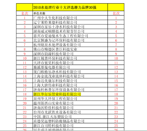 浙江華爾樂管業(yè)2010年被評為水處理十大評選潛力品牌行業(yè)30強
